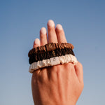 This three pack will include 2 x Vanilla, 1 x Evergreen, 1 x Merry Red, 1 x Cacao, 1 x Coal colored Piña Everyday Hair Ties™.